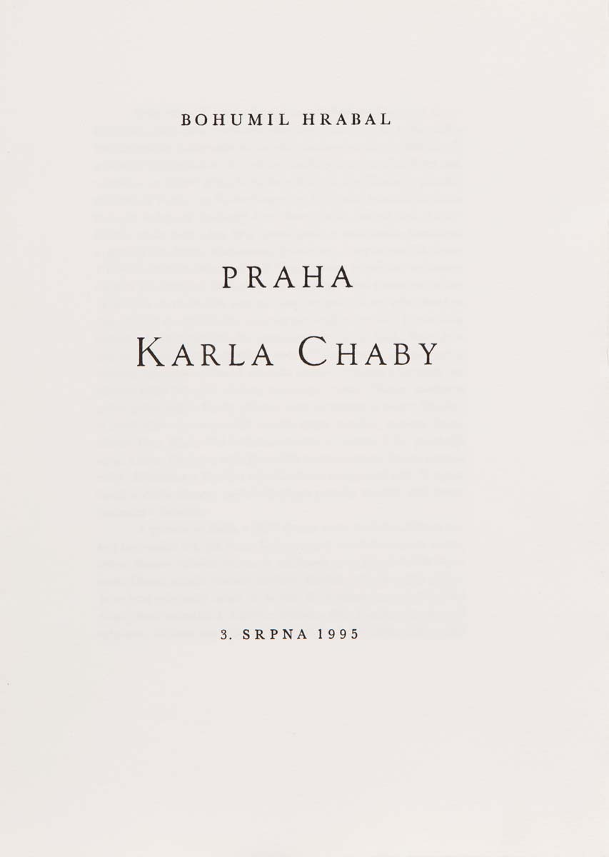 Popis:Text Bohumil Hrabal. Vydáno k 70. narozeninám K Chaby, v počtu 100 číslovaných exemplářů, číslo nabízeného výtisku 31.