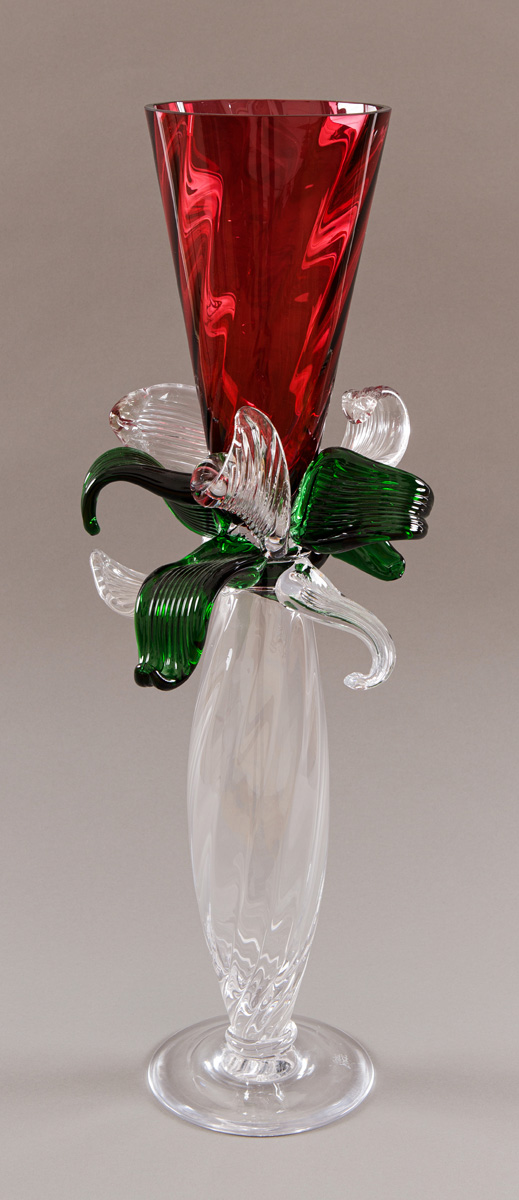 rubínová reliéfně zdobená kupa, se zelenočirým listovým dekorem na čiré duté nožce