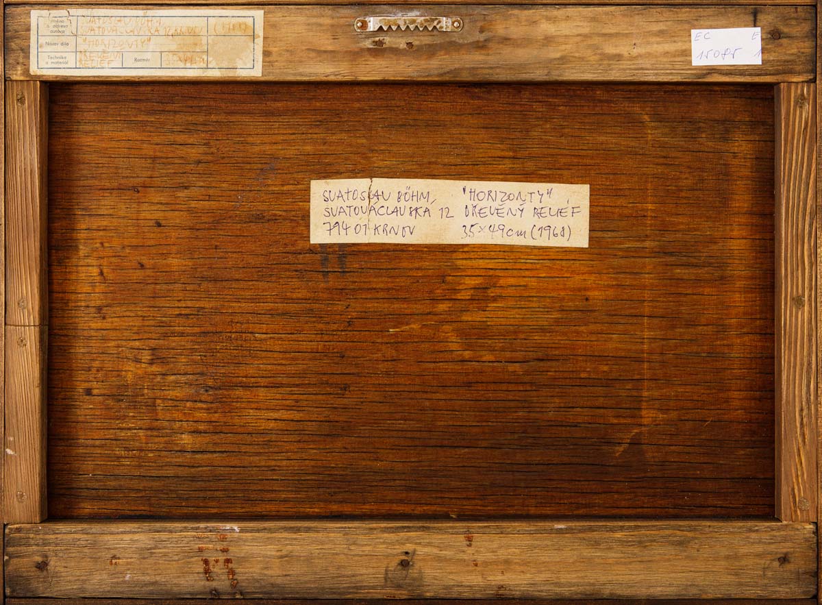 Popis:Sběratelsky vzácné dílo, typický autorův dřevěný reliéf, poskládaný z materiálů pro výrobu varhan (kdysi světově proslulá továrna Rieger – Kloss). S příchodem normalizace Böhm opouští progresivní tvorbu dřevěných reliéfů a věnuje se neutrální geometrické tvorbě a ilustraci.