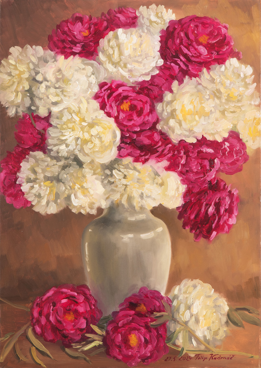Kudrnáč Filip(1975 - )Růžové a bílé pivoňky v čínské váze,2024
