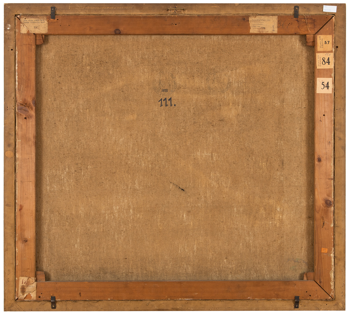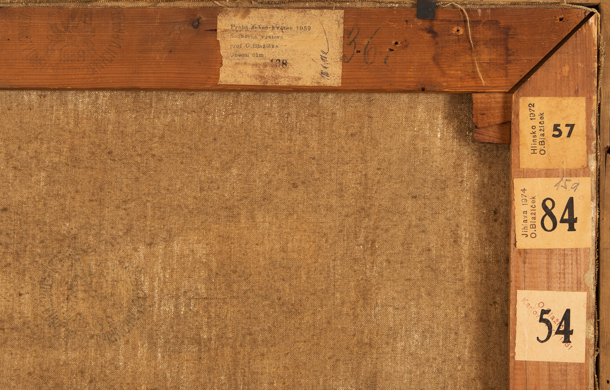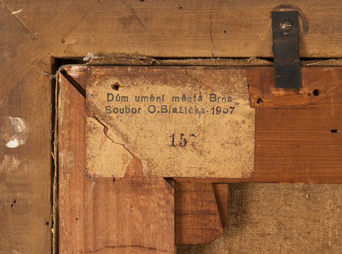 na rubu: štítky č. 57 Hlinsko 1972, č. 84 Jihlava 1974, č. 54 Karlovy Vary 1981, č. 138 Praha Obecní dům 1959, č. 157 Dům umění města Brna 1957, č. 12 a razítko Jednota umělců výtvarných v Praze 1938