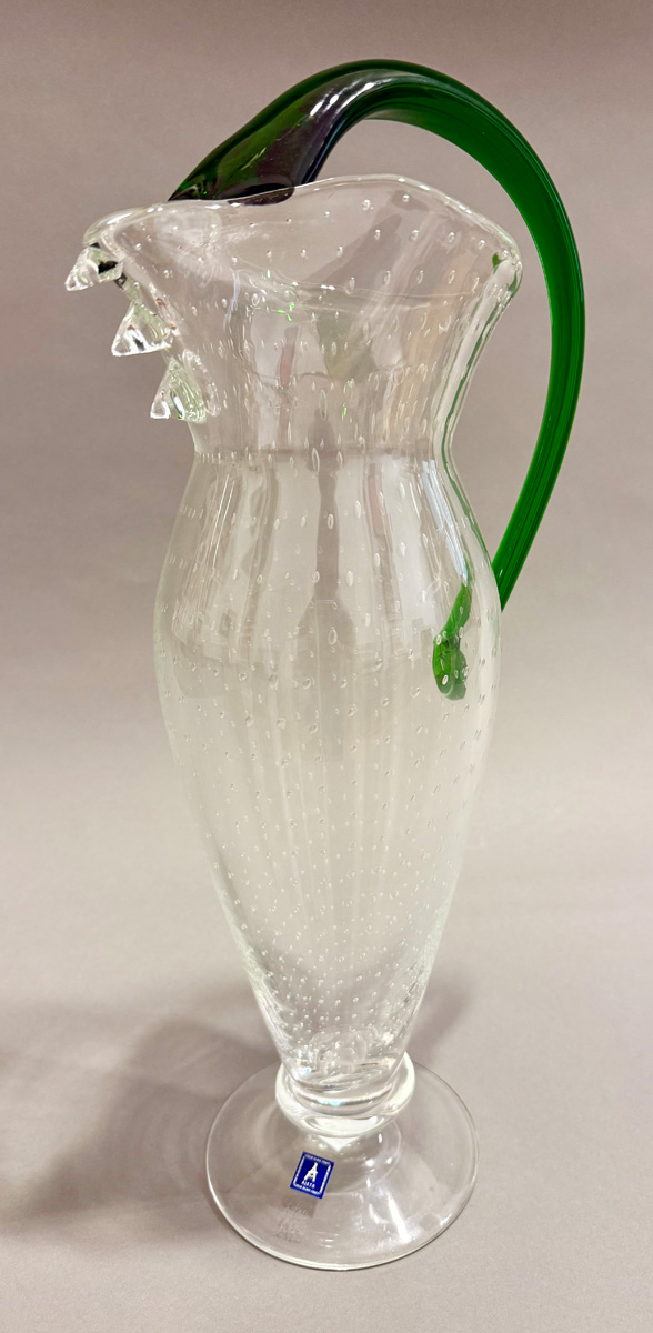 čiré sklo s bublinovým dekorem a smaragdovým uchem